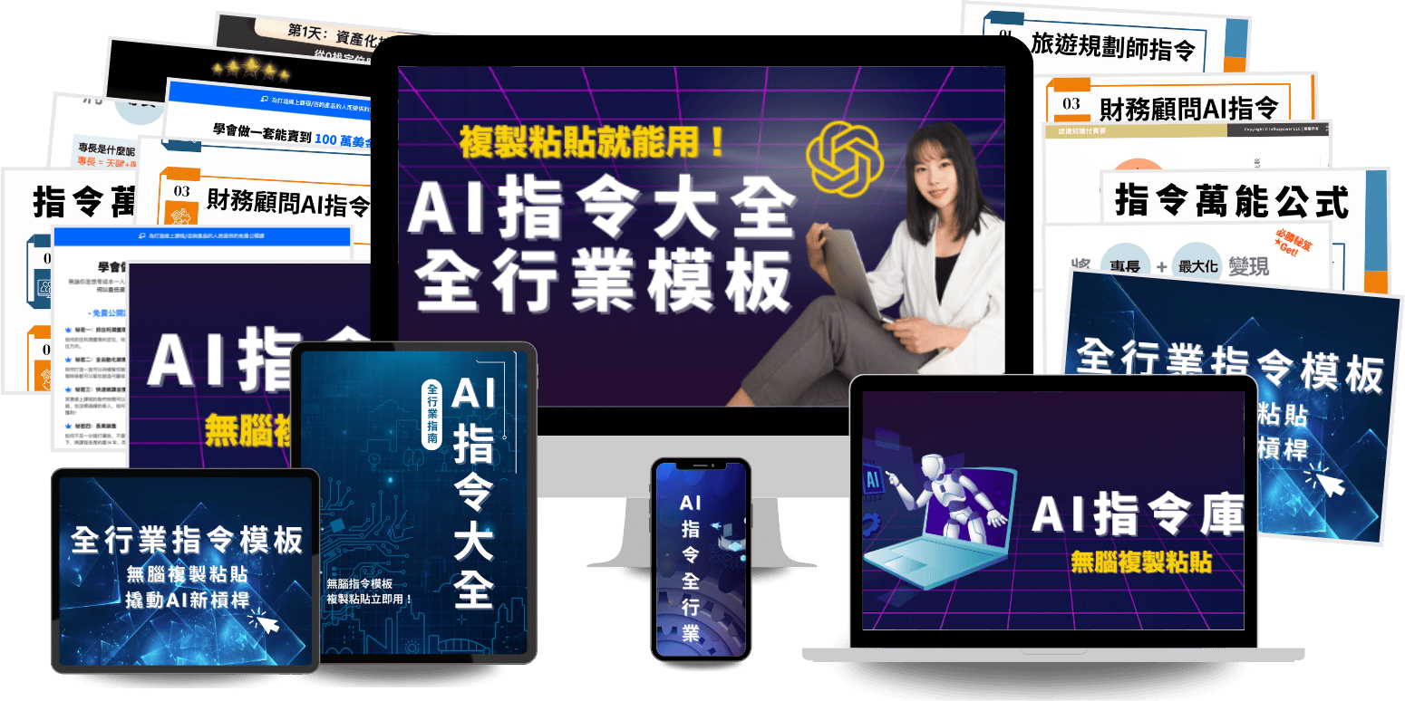 除了基本的AI知識,還會給你複製就能用的30個+行業指令模板,讓你1句指令就能輕鬆應用於日常工作。節省時間,提高創意質量,創造突破性的解決方案。