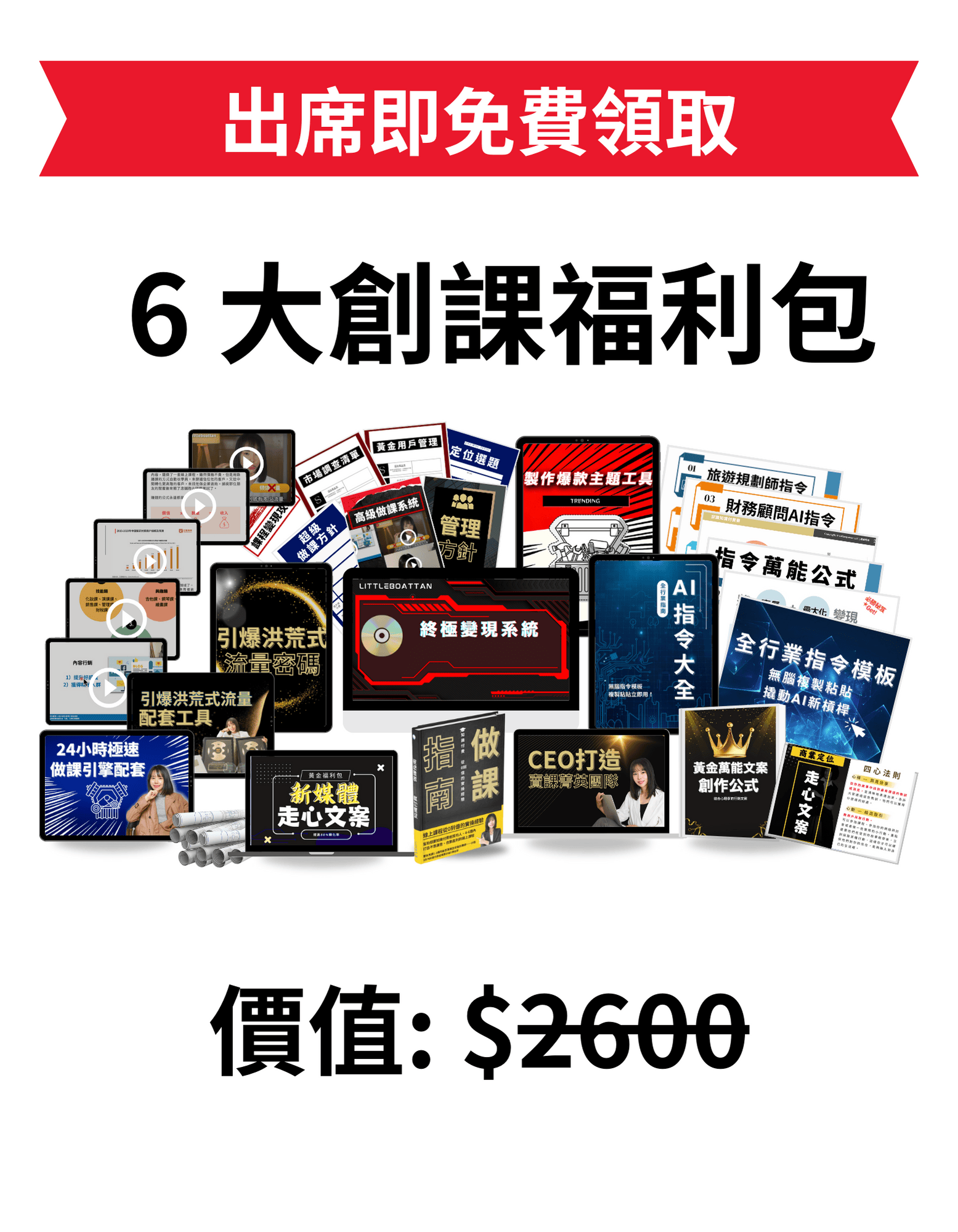 2 天的訓練營活動結束後,你可以免費獲得,總價值 $2600 美金福利